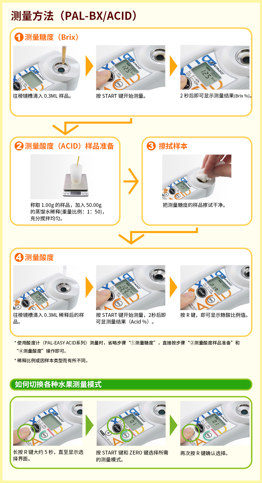 使用ATAGO(愛拓)糖酸度計(jì),糖度可直接取樣測量;酸度測量只需添加蒸餾水與測量樣品按重量比例(1:50)稀釋(即:果汁1ml,蒸餾水50ml)攪拌均勻后即可取樣測量。糖度及酸度測量完成后,按R鍵自動顯示糖酸比。