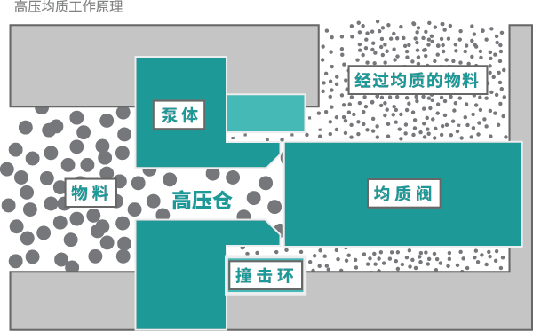 物料由物料杯經(jīng)單向閥進(jìn)入高壓倉,通過泵體伸縮加壓使樣品達(dá)到所調(diào)節(jié)控制的高壓下,通過特定寬度的限流縫隙瞬間釋放形成微射流撞擊沖擊閥或均質(zhì)閥上,依次經(jīng)過空穴、撞擊、剪切的作用來達(dá)到物料的乳化分散和細(xì)胞粉碎機的目的。