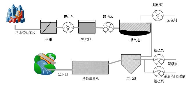蘭格蠕動泵產(chǎn)品在水處理系統(tǒng)中用于傳輸待處理的污水,或用于添加絮凝劑以及其他水處理試劑。